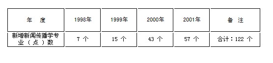 據最新統計:目前中國大陸共有國家教育部批準的新聞傳播學專業(點) 231 個,其中 122 個是 1998 年至 2001 年這 4 年中新增加的,也就是說,這 4 年來新增新聞傳播學專業(點)占總數的 53% 。另外,從簡單地統計表中還可以看出, 2000 年和 2001 年增設新聞、傳播學專業(點)呈成倍增高的趨勢。