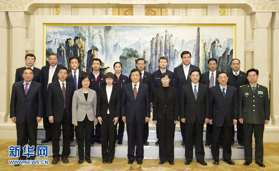 12月17日,中共中央政治局常委劉云山在北京人民大會堂會見羅陽同志先進事跡報告團成員。這是報告會前,劉云山與報告團成員合影。新華社記者 黃敬文攝