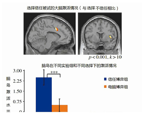 圖1:與選擇不信任相比,人們選擇信任時(shí)其前扣帶回中部(左圖)和右側(cè)前島葉皮層(右圖)被顯著激活。