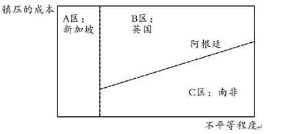 為了解釋這些不同的政治發(fā)展道路,阿塞莫格魯從社會(huì)結(jié)構(gòu)轉(zhuǎn)向經(jīng)濟(jì)結(jié)構(gòu)分析。他將社會(huì)分為精英與大眾兩大群體,這兩大群體實(shí)際上也是富人和窮人的分野。他認(rèn)為,在民主體制下,社會(huì)政策由大眾(窮人)決定,因?yàn)榇蟊姡ǜF人)在人數(shù)上居多,而在非民主體制下,社會(huì)政策由精英(富人)說(shuō)了算,[10]因此,“經(jīng)濟(jì)起源論”必須要解決問(wèn)題就轉(zhuǎn)化為:精英(富人)為什么會(huì)選擇對(duì)他們不利的民主制度呢?阿塞莫格魯認(rèn)為,大眾會(huì)以各種手段威脅精英,精英也借助鎮(zhèn)壓或政變等手段確保有利于其利益的政治制度,民主實(shí)際上只能是被逼迫出來(lái)的:當(dāng)不平等的程度較低時(shí),大眾(窮人)對(duì)現(xiàn)狀比較滿意,制度變遷(民主化)的壓力較小,精英(富人)可以在沒(méi)有鎮(zhèn)壓的情況下維持非民主政體(圖1-1中A區(qū)新加坡的位置);當(dāng)不平等程度升高后,革命就會(huì)成為一種威脅,而如果此時(shí)恰好面臨較高的鎮(zhèn)壓成本,精英(富人)往往就會(huì)放棄鎮(zhèn)壓轉(zhuǎn)向民主(圖1-1中B區(qū)英國(guó)所處的位置);當(dāng)不平等極為嚴(yán)重,從而使革命構(gòu)成對(duì)非民主政體的挑戰(zhàn),與此同時(shí)鎮(zhèn)壓成本卻非常低時(shí),精英(富人)就會(huì)有充足的動(dòng)力來(lái)鎮(zhèn)壓革命與反抗,從而長(zhǎng)期維持非民主政體(圖1-1C區(qū)南非的位置)。[11]