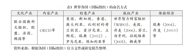 世界各國、地區(qū)和國際組織對文化產(chǎn)業(yè)的稱謂并不一樣,除了上面提到的文化產(chǎn)業(yè)、創(chuàng)意產(chǎn)業(yè)、文化創(chuàng)意產(chǎn)業(yè)外,還有內(nèi)容產(chǎn)業(yè)、體驗經(jīng)濟、版權(quán)產(chǎn)業(yè)(美國除了使用創(chuàng)意產(chǎn)業(yè)、文化產(chǎn)業(yè)外,開始更多地使用“版權(quán)產(chǎn)業(yè)”的概念,以強調(diào)“版權(quán)”對文化產(chǎn)業(yè)的關(guān)鍵作用)等名稱(見表1)。本文這一部分,將對這些名詞進行梳理和分析。
