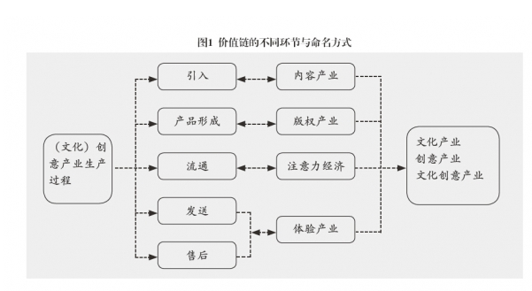 根據(jù)對文化產(chǎn)業(yè)生產(chǎn)五個階段的劃分,可以看出在不同階段其側(cè)重點不同。引入階段,側(cè)重于文化內(nèi)容的挖掘,是“原料”投入的過程,將這一階段看作產(chǎn)業(yè)核心的人將其命名為內(nèi)容產(chǎn)業(yè)。產(chǎn)品形成過程凝結(jié)了眾多擁有不同技能人員的創(chuàng)意勞動,因而也形成了產(chǎn)品的版權(quán)核心,將這一環(huán)節(jié)看作產(chǎn)業(yè)核心的人將其命名為版權(quán)產(chǎn)業(yè)。流通是一個產(chǎn)品傳播的過程,通過這一過程吸引消費者的注意力和眼球,為下一步的發(fā)送做必要準(zhǔn)備,所以這一環(huán)節(jié)可稱為注意力經(jīng)濟。最后,發(fā)送和售后是將產(chǎn)品交給消費者的過程以及聽取反饋的過程,這個過程帶給消費者的是一種體驗,因而可稱作體驗產(chǎn)業(yè)。同樣是由于側(cè)重點的不同,將文化內(nèi)容看作這個產(chǎn)業(yè)核心的人,將其命名為文化產(chǎn)業(yè)。將創(chuàng)意過程看做產(chǎn)業(yè)核心的人則將其命名為創(chuàng)意產(chǎn)業(yè),而文化創(chuàng)意產(chǎn)業(yè)是二者的折中,但在價值鏈這個分析框架下,筆者認為這三個詞的含義應(yīng)該是相同的。