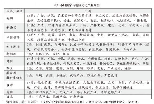 不同國家、地區(qū)對文化產(chǎn)業(yè)的分類。各個國家、地區(qū)及國際組織對文化產(chǎn)業(yè)的分類是不同的(見表2),而且不同時期也有一些變化。例如,英國在1991年將創(chuàng)意產(chǎn)業(yè)歸為文字創(chuàng)造、視覺藝術(shù)、舞臺美術(shù)、音樂、攝影、時裝6類,到1997年又增至13類,范圍擴大為廣告、建筑、美術(shù)和古董市場、手工藝、設(shè)計、時尚、電影、互動休閑軟件、音樂、表演藝術(shù)、出版、電腦軟件、電視和廣播。