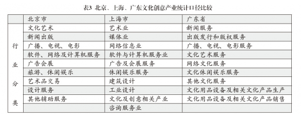北京、上海、廣東在文化創(chuàng)意產(chǎn)業(yè)統(tǒng)計口徑上略有不同。北京將文化創(chuàng)意產(chǎn)業(yè)分為9大類,上海分為10大類,廣東省分為9大類(見表3)。在行業(yè)分類上北京是根據(jù)《北京市文化創(chuàng)意產(chǎn)業(yè)分類目錄》進行統(tǒng)計;上海是根據(jù)《上海市文化創(chuàng)意產(chǎn)業(yè)分類目錄》進行統(tǒng)計;廣東是根據(jù)國家統(tǒng)計局印發(fā)的《文化及相關(guān)產(chǎn)業(yè)分類》進行統(tǒng)計。從行業(yè)大類上比較,上海比北京多出了“咨詢服務(wù)業(yè)”和工業(yè)設(shè)計業(yè);北京比廣東多出了“設(shè)計服務(wù)業(yè)”和“軟件及計算機服務(wù)業(yè)”。