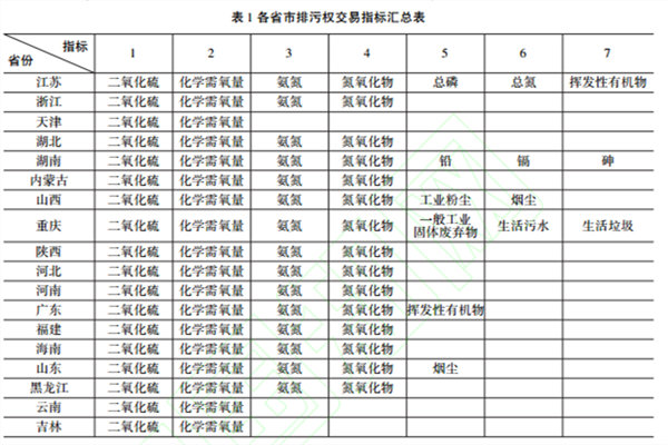 主要污染物排污權交易指的是用排污權手段減少主要污染物對環(huán)境的影響,旨在利用市場競爭和價格杠桿機制引導企業(yè)進行減排,在實現(xiàn)污染物總量控制目標的同時減少社會總治污成本和綠色技術創(chuàng)新。 主要污染物除了“十二五”規(guī)劃中的二氧化硫( SO2 )、化學需氧量(COD)、氨氮(NH3 - N)、氮氧化物(NOX )四項外,有些省份會綜合考慮省內(nèi)污染物的影響程度,增加個別標的。 如表 1 所示,江蘇增加了總磷( TP)、揮發(fā)性有機物、總氮(TN)三項指標;湖南增加了鉛、鎘、砷三項指標;山西增加了煙塵、工業(yè)粉塵兩項指標;重慶增加了一般工業(yè)固體廢棄物、生活污水、生活垃圾三項指標;山東增加了煙塵一項指標;個別省市如天津、云南、吉林等則暫時采用二氧化硫和化學需氧量作為排污權交易指標,而氨氮和氮氧化物則隨著排污權工作的推進而覆蓋;湖北、內(nèi)蒙古、陜西、河北等省份與國家主要污染物一致,沒有新增指標。