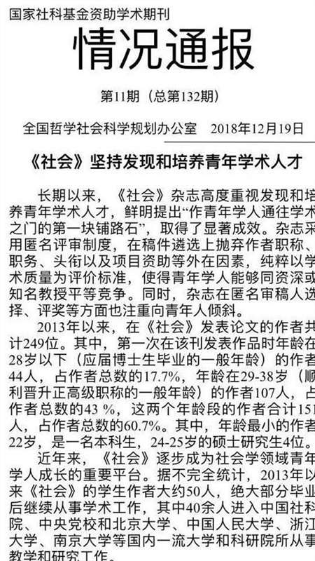 近日,全國哲學社會科學規劃辦公室主編的《國家社科基金資助學術期刊情況通報》2018年第11期報道了《社會》雜志堅持發現和培養青年學術人才的經驗和成果,是對《社會》辦刊團隊的莫大鼓勵。