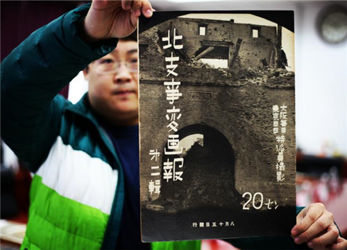 在儀式上展出的部分文獻中,北青報記者看到一本日文《北支事變畫報》,封面印有宛平城東門“順治門”被日軍炮火轟炸后的照片。以及日軍在日本本土征兵的文獻、還有和戰時馬匹相關的資料。