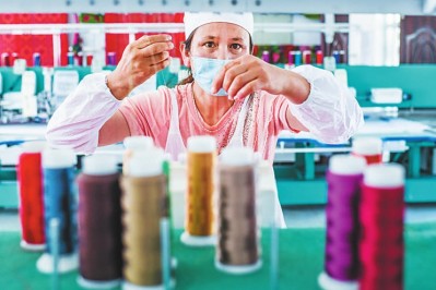 在新疆特克斯縣也什克勒克村刺繡合作社,村民在制作紡織品。新華社發