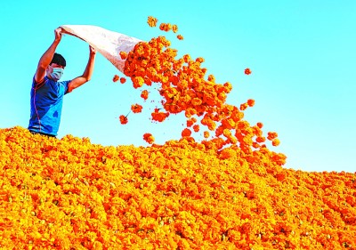 新疆于田縣農民將稱重后的萬壽菊倒入發酵池。新華社發