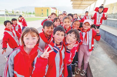 新疆塔什庫爾干塔吉克自治縣城鄉寄宿制小學學生在課外活動時合影。新華社發