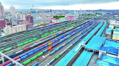 中歐班列已成為中國與“一帶一路”共建國家互聯互通互惠的重要載體。圖為中歐班列在中國鐵路哈爾濱局集團有限公司滿洲里站編組場內等待發車。