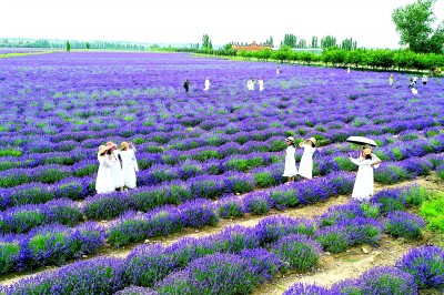 游客在新疆伊犁霍城縣薰衣草農(nóng)場游玩。新華社發(fā)