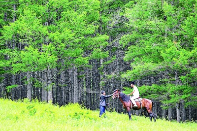 游客在內蒙古阿爾山國家森林公園體驗騎馬。新華社發