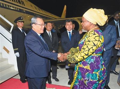贊比亞副總統納盧曼戈和中國駐贊比亞大使韓鏡到機場迎接。